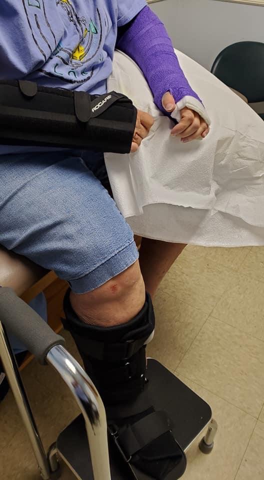 Sara was right! They determined at the hospital that Judy had broken her left wrist. After her appointment with the ortho today, she was told she also has a hairline fracture in her right wrist and strained ankle. She is in a boot, has a soft cast/wrap on her left arm (in purple, of course), and a removable splint on her right wrist. The doctor said that she did the most damage she could do to her knees without actually breaking anything. Her bruises are numerous. We know that her days will get worse before they get better.